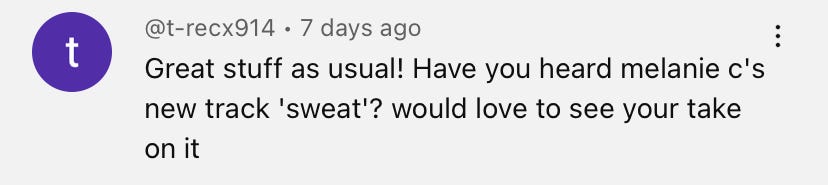 This week’s track was a request by t-recx914 on YouTube - I’m taking on Sweat by Melanie C.
